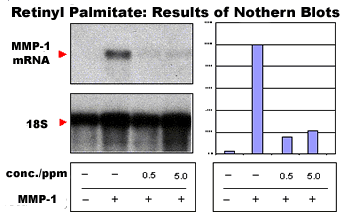 As expected, the irradiation of fibroblasts with simulated sunlight (UVA dosage of 10 J/cm2) caused strong induction of the synthesis of MMP-1 mRNA. Retinyl palmitate and antioxidants such as propyl gallate reduce the sunlight-induced expression of MMP-1 very effectively by around 80% or 50 to 75% and thus prevent photoageing of the skin.