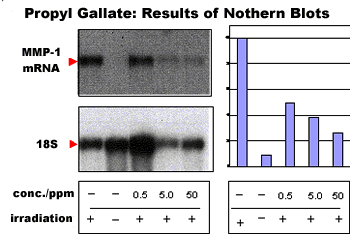 These harmful enzymes cleave collagen, the main component of the skin's connective tissue and thus cause wrinkles to form prematurely (5,6). A reduction in MMP-1 synthesis after the skin has been exposed to sunlight is thus a primary objective in the development of anti-ageing-products. An ideal anti-ageing substance is one that, even at a low concentration, inhibits the expression of collagenase MMP-1. The production of mRNA is the first and thus the most important step in the MMP-1 synthesis. Active substances that have an effect on mRNA production thus also automatically have an effect on the amount of protein and the enzyme activity of MMP-1. The quantification of the MMP-1 synthesis in sun-irradiated dermal fibroblasts was carried out by determining the amount of MMP-1 mRNA synthesized in the Northern Blot (5).
