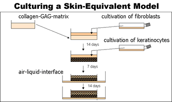 After it has been cultured, the skin-equivalent model lives for at least another 4 weeks, during which time it remains virtually unchanged. During this time ageing experiments can be carried out, e.g., with UV irradiation or ozone, or tests of topical skin-protection or skin-care treatments. The main advantage is that, just like normal human skin, these skin models have a stratum corneum. The active substances can therefore be applied under realistic conditions in a cream or gel basis. The active substances penetrate through the stratum corneum into the skin, where they take effect.