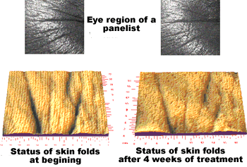 The smoothing of the wrinkles after treatment with the cream can be seen clearly. As a result, in the subsequent questionnaire the volunteers rated skin smoothness (1.9), skin structure (2.2), skin suppleness (1.9) and skin tautness (2.4) very highly.