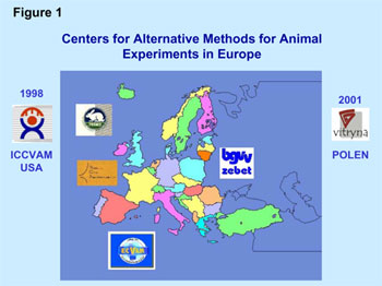 Figure 1 shows the European centers for the furtherance of alternative methods. The illustration explains that accordingly in Great Britain, Nottingham, the foundation FRAME (Fund for the Replacement of Animals in Medical Experiments) and in the Netherlands the NCA (National Center for Alternatives) in the Reichsgesungheitsamt (RIVM) have been founded as well as the EU Validierungszentrum ECVAM (European Center for the Validation of Alternative Methods) in the Gemeinsame Forschungsstelle (GFS) (Common Research Center) in ISPRA/Italy by the EU Commission in 1992. Because of the success of the European Centers, the Validation Center ICCVAM (Interagency Coordinating Committee for the Validation of Alternative Methods) was founded in the frame of the National Toxicology Program NTP outside of Europe by the US government in the year 1995 and Poland, as future joining member of the EU established the Zentrum für Alternativmethoden "Vitryna" (Center for Alternative Methods) in Lodsz in 2001.