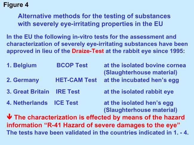 In Europe, a large number of alternative methods for the replacement of the Draize-Test has been developed and validated. To date the application of the new methods is only admitted for the classification and characterization of substances with severely eye-irritating properties. In Figure 4 the four alternative methods are listed which have been developed and validated in different EU member states. Test results, which have been obtained with the four in-vitro tests, are approved by all EU member states. Less positive is the situation outside of Europe, although the OECD calls with emphasis for the development of alternative methods for the Draize-test at the rabbit eye by its member states. Animal-experiment free in-vitro tests for a differentiation of non- and minor eye-irritating properties which are of importance for the cosmetics industry, have not yet been accepted for official purposes despite intensive experimental validation. The 7th amendment of the EU Cosmetics Directive takes that into consideration.