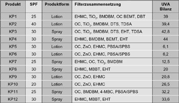 Die Produktdeklaration hinsichtlich des UVB-Schutzes erfolgt einheitlich mit dem Lichtschutzfaktor (LSF, LF oder SPF), der nach einer von der COLIPA normierten in vivo-Methode bestimmt wird (1). Der Verbraucher ist mit dieser Deklaration vertraut und beachtet sie bei der Produktauswahl. Weit weniger stringent ist die Situation bezüglich der UVA-Strahlung und des UVA-Schutzes, obwohl die intensiven Forschungsaktivitäten der letzten Jahre ebenfalls eindeutig einen schädigenden Effekt dieser langwelligen UV-Strahlen belegen konnten. Primär steht hier die extrinsische Hautalterung im Fokus (2). Die Lichtalterung der Haut (Photo-aging) hinterlässt – auch für den Verbraucher leicht erkennbar – sichtbare Spuren. Darüber hinaus ist UVA-Strahlung als auslösender Faktor für Lichtdermatosen bekannt. Ebenso konnten Schädigungen der Zellkerne von Hautzellen nachgewiesen werden (3). Dennoch spielt die Höhe des UVA-Schutzes bisher bei der Produktauswahl eine untergeordnete Rolle. Die Orientierung des Verbrauchers wird zusätzlich dadurch erschwert, dass die Ermittlung der Höhe des UVA-Schutzes und der zugehörigen Deklaration nicht einheitlich geregelt ist. Die meisten Hersteller folgen bei der Bestimmung des UVA-Schutzes den Vorgaben der Australischen Norm (4). Deren Anforderungen sind erfüllt, sobald ein Sonnenschutzmittel die Transmission im Bereich von 320 – 360 nm um mindestens 90 % reduziert. Die Australische Norm sieht oberhalb dieses Schwellenwertes keine weitere Differenzierung vor. Dies führt dazu, dass bei Einhaltung dieses Standards bei Produkten mit niedrigem SPF noch ein adäquater UVA-Schutz sichergestellt ist, mit steigendem SPF allerdings der UVA-Schutz auf gleich bleibendem Niveau stagnieren kann, ohne die Norm zu verletzen; der UVA-Schutz wächst also nicht zwangsläufig mit dem UVB-Schutz. Dies führt dazu, dass bis zum erreichen der Erythemschwelle mit steigendem SPF der verwendeten Sonnenschutzprodukte eine zunehmend höhere UVA-Dosis auf die Haut einwirkt (Abb.2). Vergrößerte Version Diese unbefriedigende Situation führte in der Vergangenheit dazu, dass in nationalen und internationalen dermatologischen Arbeitsgruppen parallel zur Entwicklung von Produktkonzepten, die einen höheren UVA-Schutz ermöglichen, auch Werkzeuge entwickelt wurden, die eine differenzierte Messung und Kennzeichnung des UVA-Schutzes ermöglichen. Als erster deutlicher Schritt in Richtung einer international harmonisierten Vorgehensweise existiert hierzu seit Februar 2005 eine neue Deutsche Industrienorm (DIN 67502) (5). Das besondere an der dort beschriebenen Methode ist, dass der UV-Schutz zunächst in vitro bestimmt wird und der erhaltene Messwert anschließend zum in vivo-Lichtschutzfaktor des Testproduktes in Beziehung gesetzt wird. Nach dem Prinzip der DIN 67502 wurde bereits in den vergangenen beiden Jahren die UVA-Schutzleistungen von Produkten mit SPF 10-12 ermittelt (6,7). Dabei wurde festgestellt, dass Produkte mit den höchsten UVA-Schutzleistungen von Herstellern angeboten werden, die sich seit Jahren intensiv in Forschung und Entwicklung mit dem Thema Sonnenschutz befassen. Dagegen wiesen Discounterprodukte einen im Mittel relevant niedrigeren UVA-Schutz auf. Zielsetzung Die vorliegende Untersuchung verfolgt erneut das Ziel, die UVA-Schutzleistung von aktuell im Handel erhältlichen Sonnenschutzmitteln zu bewerten. Die Studie schließt dieses Mal im Wesentlichen Sonnenschutzprodukte mit Lichtschutzfaktoren (SPF) zwischen 20 und 30 sowie Sonnenschutzprodukte für Kinder mit einem SPF zwischen 25 und 30 ein. Unter Anwendung der DIN 67502 soll überprüft werden, ob der erhöhte UVB-Schutz auch von einem angemessen hohen UVA-Schutz begleitet wird. Besonderes Augenmerk liegt dabei auf Sonnenschutzmitteln für Kinder, da bei diesen in den letzten Jahren eine deutliche Leitungssteigerung hinsichtlich der Lichtschutzfaktoren zu beobachten war. Dies deckt sich mit der Empfehlung, für Kinder Sonnenschutzprodukte mit höheren Lichtschutzfaktoren zu verwenden, da sich viele der natürlichen Schutzmechanismen der Haut erst zwischen dem zweiten Lebensjahr und der Pubertät entwickeln. Uneingeschränkt empfehlenswerte Produkte sollten die empfindliche Kinderhaut durch besonders hohe Lichtschutzfaktoren vor Sonnenbrand und durch eine angepasste UVA-Schutzleistung gleichermaßen vor langfristigen lichtbedingten Schäden bewahren. Untersuchte Proben Für die Untersuchung wurden insgesamt 31 Sonnenschutzprodukte in Drogeriemärkten, im Lebensmittelhandel und in Apotheken eingekauft. Getestet wurden Körperlotionen, Gesichtscremes und Sprays mit unterschiedlichen UV-Filtersystemen und SPF-Werten zwischen 15 und 40; darunter 19 Standard- und 12 Kindersonnenschutzprodukte. Auf den meisten Produkten wurde UVA-/UVB-Breitbandschutz nach dem Australischen Standard AS 2604 ausgelobt. In nur wenigen Fällen wurde – ohne Hinweis auf den Australischen Standard – ein besonders gut balanciertes oder ausgewogenes Verhältnis von UVA- und UVB-Schutz ausgelobt. Detailinformationen zum SPF, der Produktkategorie sowie den Filtereigenschaften finden sich in Tab. 1 und Tab. 2.