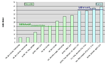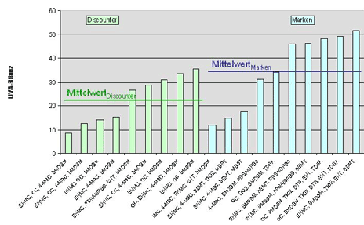 Bei den getesteten Sonnenschutzprodukten für Kinder fielen die Qualitätsunterschiede hinsichtlich der UVA-Schutzleistung noch ausgeprägter aus (Abb. 4). In dieser Gruppe zeichnen sich alle Produkte von forschungsaktiven Herstellern durch höhere UVA-Bilanzwerte im Vergleich zu den Discounterprodukten aus. Mit einem UVA-Bilanzwert von 51,7 schützt das beste Markenprodukt mehr als achtmal besser vor UVA-Strahlen als das am schlechtesten schützende Dicounterprodukt mit einem UVA-Bilanzwert von lediglich 6,1. Im Mittel schützen Kindersonnenschutzprodukte von Markenherstellern mehr als doppelt so gut wie solche von Discountern: Kinderprodukte von Markenartikelherstellern erreichten beim UVA-Schutz einen Mittelwert von 41,3. Dagegen lag der Mittelwert der Kinderprodukte, die bei Discountern erhältlich sind, bei 19,7.