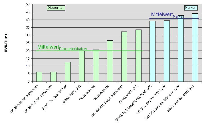 Abkürzungen: BEMT= Bis-Ethylhexyloxyphenol Methoxyphenol Methoxyphenyl Triazine BMDBM= Butyl Methoxydibenzoylmethane DBT = Dietyhlhexyl Butamido Triazone DTS = Drometrizole Trisiloxane EHMC = Ethylhexyl Methoxycinnamate EHT = Ethylhexyl Triazone HD = Hydrodispersion IMC = Isoamyl p-Methoxycinnamate MBC = Methylbenzylidene Camphor OC = Octocrylene SPBS = Sodium Phenylbenzimidazole Sulfonate TiO2 = Titanium Dioxide TDSA = Terephthalidene Dicamphor Sulfonic Acid ZnO = Zinc Oxide Bestimmung der UVA-Bilanz Die UVA-Schutzleistung wurde, wie in der DIN 67502 beschrieben, als UVA-Bilanz berechnet. Die Bestimmung der UVA-Bilanz beruht auf der Bestimmung des spektralen Transmissionsgrads τ(λ) einer Probe im Wellenlängenbereich 290 nm ≤ ? ≤ 400 nm. Hierzu wird ein Sonnenschutzmittel in einer Menge von 0.75 mg/cm2 gleichmäßig auf eine einseitig angeraute Plexiglas (PMMA)-Platte aufgetragen und mit einem geeigneten Spektralphotometer (LOT-ORIEL-INSTASPECII Komponentengerät) vermessen, das es durch die probennahe Anordnung einer räumlichen Integrationseinheit (z. B. Ulbrichtkugel, Diffusor) erlaubt, auch den diffusen Anteil der transmittierten Strahlung zu erfassen. Für jedes Produkt werden 3 Platten vorbereitet, auf denen 4 einzelne Messungen durchgeführt werden. Sofern die Absorption den Wert von 2 überschreitet, wird der Vorgang mit entsprechend verringertem Auftragsvolumen wiederholt (8). Mit dem spektralen Transmissionsgrad einer Probe im UV-Bereich (290 nm bis 400 nm) wird zunächst der in vitro Sonnenschutzfaktor SFin vitro, er errechnet (nach DIN 5031-10). Bei Ungleichheit zu dem auf der Packung angegebenen in vivo Sonnenschutzfaktor SFin vivo, er wird die Extinktionskurve über eine Konstante angepasst. Der resultierende Korrekturfaktor wird für die weiterführende Berechnung des in vitro PPD-Schutzfaktors SFin vitro, PPD, d. h. einem UVA-relevanten biologischen Endpunkt, herangezogen. Dabei wird das PPD (persistent pigment darkening)-Wirkungsspektrum (9) und die spektrale Bestrahlungsstärke Eλ(λ) einer Referenz-UVA-Strahlungsquelle benutzt (siehe Anhang A). Diese entspricht den Anforderungen für Strahlenquellen zur Bestimmung des in vivo PPD-Schutzfaktors SFin vivo, PPD nach dem japanischen Prüfverfahren (10). Auf Basis des in vivo Sonnenschutzfaktors SFin vivo, er und des SFin vitro, PPD wird die UVA-Bilanz berechnet, die das Verhältnis von UVA-Schutz zum ausgewiesenen Sonnenschutzfaktor SFin vivo, er kennzeichnet. Die UVA-Bilanz ist definiert durch: Ergebnis und Diskussion Auch bei der Untersuchung von Produkten mit höherem LIchtschutzfaktor lässt sich die neue DIN-Methode zur Bestimmung der UVA-Schutzleistungen uneingeschränkt und problemlos anwenden. Die Einzelergebnisse finden sich in Tab. 1 und Tab. 2 wieder. Die ermittelten UVA-Bilanzwerte variieren in einem Bereich von 6,1 bis 51,7. D.h., die Unterschiede sind bei Produkten mit höherem SPF noch stärker ausgeprägt, als bei den Produkten mit SPF 10 bis 12, die in den Vorjahren getestet wurden (6,7). Diese große Streubreite war allerdings vorherzusehen: Bei höherschützenden Produkten muss sich nahezu zwangsläufig eine ausgeprägter Unterschied ergeben, je nachdem, ob ein Produkt gerade eben den Australischen Standard erreicht oder ob es einen optimal ausgeglichenen UVA- und UVB-Schutz aufweist. Aufgrund der Erfahrung der Vorjahre wurden die ermittelten UVA-Bilanzwerte differenziert nach der Herkunft der Produkte, d.h. ob von forschenden Herstellern oder Discountern, betrachtet. In der Gruppe der Standardprodukte schnitten Sonnencremes, Lotions und Sprays von forschenden Herstellern im Mittel um 54 Prozent besser ab, als Discounterprodukte (Abb. 3). Den bestmöglichen UVA-Bilanzwert von 51,7 erreichte ein Markenprodukt. Dagegen kam das beste Sonnenschutzmittel in der Gruppe der Discounterware über einen UVA-Bilanzwert von 35,6 nicht hinaus.