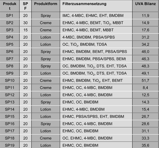 Abkürzungen: BEMT= Bis-Ethylhexyloxyphenol Methoxyphenol Methoxyphenyl Triazine BMDBM= Butyl Methoxydibenzoylmethane DBT = Dietyhlhexyl Butamido Triazone DTS = Drometrizole Trisiloxane EHMC = Ethylhexyl Methoxycinnamate EHT = Ethylhexyl Triazone HD = Hydrodispersion IMC = Isoamyl p-Methoxycinnamate MBC = Methylbenzylidene Camphor OC = Octocrylene SPBS = Sodium Phenylbenzimidazole Sulfonate TiO2 = Titanium Dioxide TDSA = Terephthalidene Dicamphor Sulfonic Acid ZnO = Zinc Oxide