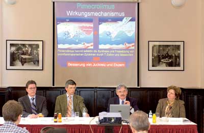 Anlässlich ihrer 9. Jahrestagung richtete die GD im altehrwürdigen Café Griensteidl in Wien eine gut besuchte Pressekonferenz aus. Als Experten standen den Journalisten (von links) der GD-Vorsitzende Dr. Joachim Kresken, der wissenschaftliche Tagungsleiter Professor Dr. Werner Aberer, der DDG-Generalsekretär Professor Dr. Thomas Luger und das GD-Vorstandsmitglied Professor Dr. Monika Schäfer-Korting zur Verfügung. Professor Luger informierte über Neuigkeiten zur Therapie des atopischen Ekzems mit Pimecolimus-Creme und Tacrolimus-Salbe. Nach seiner Auffassung gibt es für den geplanten Warnhinweis der amerikanischen Gesundheitsbehörde FDA, wonach durch die Anwendung dieser Präparate die Entstehung von Hauttumoren und Lymphomen begünstigt werden könnte, keine wissenschaftliche Rechtfertigung.