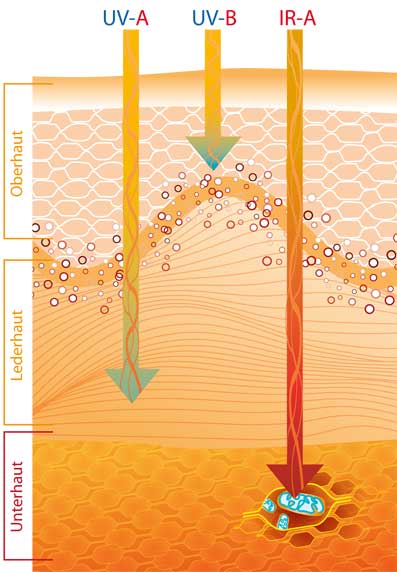 Oxidativer Stress durch IRA in den Mitochondrien IRA-Strahlung ist wesentlich energieärmer als ultraviolettes Licht, dringt aber im Vergleich zum UV-Licht tiefer in die Haut ein – und zwar unabhängig vom Hauttyp. Wie Professor Krutmann berichtete, penetrieren 48 Prozent der IRA-Strahlung des Sonnenlichts bis in die Dermis und 17 Prozent sogar bis in die Subkutis (Abbildung 2). Dort schädigt sie die Kollagenstruktur und beschleunigt dadurch die Hautalterung. Interessanterweise, so Krutmann, spielen bei der IRA-bedingten Hautschädigung die Mitochondrien eine besondere Rolle. Anders als UV-Strahlung, die nur an den Zellmembranen wirkt, dringt IRA-Strahlung in die Zellen ein und bewirkt in den Mitochondrien die Bildung von aggressiven Sauerstoffspezies (freie Radikale), die ihrerseits eine retrograde Signaltransduktion auslösen. Die Signaltransduktion führt letztlich dazu, dass die Expression des Enzyms Matrixmetalloproteinase-1 (MMP-1, Kollagenase-1) gesteigert wird, was zu einem Abbau von Kollagen in der Haut und damit zur beschleunigten Hautalterung führt. Ob der IRA-induzierte erhöhte oxidative Stress auch mit einer gesteigerten Kanzerogenität assoziiert ist, ist nach Angaben von Krutmann derzeit noch unklar. Krutmann und sein Team vom Institut für Umweltmedizinische Forschung der Heinrich-Heine-Universität Düsseldorf beließen es jedoch nicht bei der Theorie, sondern entwickelten auch Strategien, um IRA-bedingten Hautschäden entgegenzuwirken. In einem Screeningprogramm identifizierten die Wissenschaftler eine spezielle Mischung von verschiedenen Antioxidantien mit hoher Schutzleistung gegen kurzwelliges Infrarotlicht. Dieser IRA-Schutzkomplex ist heute Bestandteil der apothekenexklusiven Sonnenschutzserie Ladival®.