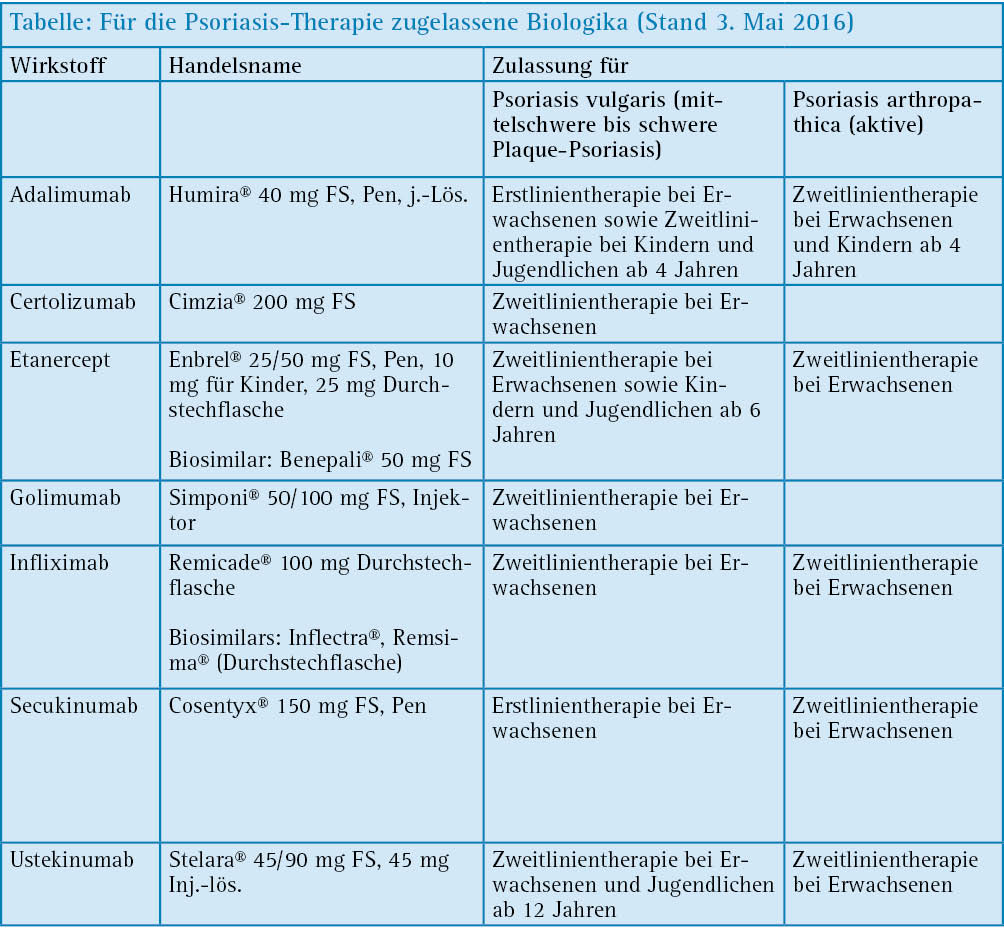 Weitere Forschungsergebnisse aus dem Arbeitskreis von Professor Müller-Goymann stellten deren Doktorandinnen Anja Täuber und Julia Dietsch in Kurvorträgen zu ihren Postern mit den Titeln „Differential scanning calorimetry on human nail clippings, keratin films and bovine hoof plates – effect of formulation ingredients” beziehungsweise „Equilibrium Dialysis with various membranes for API transport studies” vor. Ihre Arbeiten wurden mit dem „Hans Christian Korting-Nachwuchspreis für Dermopharmazie“ ausgezeichnet. Dermatotherapie mit Biologika Im Mittelpunkt der Vortragssitzung „Dermatopharmakologie und Dermatotherepie“ standen Biologika. Privatdozent Dr. Andreas Körber, Essen, gab einen Überblick über die zur Behandlung der Psoriasis zugelassenen Biologika (siehe Tabelle). Außerdem äußerte er sich zu den Perspektiven von neueren Biologika, die zum Zeitpunkt der Tagung noch nicht zugelassen beziehungsweise noch nicht im Markt waren.