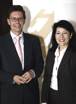 Die Präsidentin der Apothekerkammer Nordrhein, Anneliese Menge, hier im Bild mit dem GD-Vorsitzenden Dr. Joachim Kresken, gratulierte der GD zu ihrer „Erfolgsgeschichte von Qualität, Kompetenz und Interdisziplinarität“. In einem Grußwort zur Eröffnung der Festveranstaltung lobte sie die Öffentlichkeitsarbeit und die Leitlinienarbeit der GD, von der Hautärzte und Apotheker gleichermaßen profitierten.