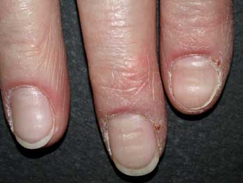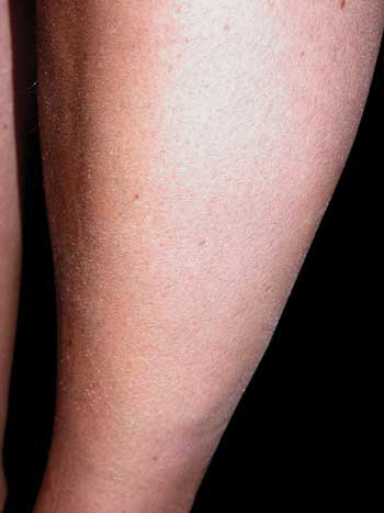 Berufliche Noxen Stark beansprucht wird die Hydrolipidschicht der Haut durch berufliche Tätigkeiten, die mit intensiver Feuchtarbeit verbunden sind. Besonders hiervon betroffen sind zum Beispiel Beschäftigte des Friseurhandwerks, des Bau- und Metallgewerbes sowie der Gesundheitspflege. Durch ständigen Hautkontakt zu Wasser oder wässrigen Lösungen potenzieller Irritanzien können neben den auf der Hautoberfläche angereicherten Talgdrüsenlipiden auch die Lipide des Stratum corneum aus der Haut herausgelöst werden. Es kommt zu einer Schädigung der Hautbarriere mit einer Erhöhung des transepidermalen Wasserverlusts. Klinisch zeigt sich ein Bild, bei dem alle Merkmale eines Ekzems zusammentreffen können (Abbildung 3): hydrolipidarme Haut, Mazeration, Rötung, Nässen, Rauhigkeit, Bläschen, Risse und Krustenbildung. Subjektiv kommt es oft zu mehr oder weniger starkem Juckreiz, Brennen, einer Einschränkung des taktilen Empfindungsvermögens sowie mitunter zu Schmerzen. Durch die gestörte Barriere und abgeschwächte Abwehrfunktion der Epidermis können sich zudem Infektionen und Kontaktsensibilisierungen leichter den Weg bahnen.