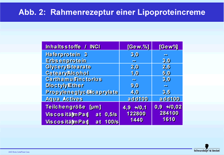 Autorenbeitrag Armin Wadle*, Marianne Waldmann-Laue Multifunktionelle Emulsionssysteme: Lipoprotein - Cremebasis *Schwarzkopf&Henkel und Zentrale Forschung Henkel, Düsseldorf Vortrag anlässlich des GD-Symposiums "Wirkungen von Dermokosmetika" in Düsseldorf am 17. Oktober 2001 Von modernen Hautpflegeprodukten erwarten die Verbraucher eine rasche und nachvollziehbare Verbesserung der Hautqualität. Um diesem Anspruch gerecht zu werden, rückt im multifunktionellen Aufbau einer kosmetischen Formulierung die Cremegrundlage verstärkt in den Fokus der Produktentwicklung. Cremegrundlagen werden dann nicht nur als Träger von Wirkstoffen verstanden, sondern sie verkörpern ein multifunktionelles Wirkprinzip für eine rasche und nachvollziehbare kosmetische Leistung. Lipoprotein-Cremebasis Solche multifunktionellen Cremebasen können mit Hilfe der Lipoproteine aufgebaut werden. Lipoproteine bestehen aus Protein oder Proteinhydrolysaten, die aus den Samen der Pflanzen wie z.B. Hafer, Erbse oder Hibiscin gewonnen werden (Abb. 1). Entsprechend der spezifischen Aminosäurensequenz besitzen sie einen amphiphilen Charakter mit hydrophilen und lipophilen Teilstrukturen. Eine Eigenschaft, die z.B. in der Lebensmittelindustrie zur Emulsionsherstellung ausgenutzt (1) wird. In Hautpflegeprodukten findet man sie heute dagegen überwiegend als Wirkstoff zur Verbesserung der Hautverträglichkeit oder des Hautgefühls (2, 3) . Neuere physikalisch-chemische Untersuchungen zeigen nun, dass Lipoproteine neben dem klassischen Einsatzgebiet der Emulgierung auch zur Stabilisierung von kosmetischen Öl-in-Wasser (O/W) Emulsionen eingesetzt werden können. Diese Proteincremes zeichnen sich dann durch ein rein pflanzliches Emulgatorsystem mit einer exzellenten Hautverträglichkeit aus. Gleichzeitig verbessern sie, entsprechend dem multifunktionellen Ansatz einer modernen Cremegrundlage, aktiv die Hautqualität wie z.B. das Oberflächenprofil oder die Hautgeschmeidigkeit. Rezepturtechnik In Abbildung 2 ist der typische Emulsionsaufbau einer Lipoprotein-Creme dargestellt. Im wesentlichen werden Proteine durch die klassischen Emulsionsbestandteile wie Konsistenzgeber und Ölphase, zur Einstellung der kosmetischen Eigenschaften, ergänzt. Für den Emulgierprozess werden die Proteine zunächst in der heißen Wasserphase aufgeschlossen, wobei diese dann zum Teil hydrolisieren und eine Proteindispersion entsteht. Darauf erfolgt der eigentliche Emulgierschritt mit der Zugabe der Ölphase und den Konsistenzgebern. Es hat sich hierbei gezeigt, dass besonders grenzflächenaktive, polare Lipide wie z.B. das Distelöl zusätzlich zur Emulgierleistung beitragen. Von dieser vorteilhaften Assoziation Lipid und Protein leitet sich dann auch der Name "Lipoprotein-Creme" ab. Grenzflächenaktivität und Isoelektrischer Punkt Da die Lipoprotein-Cremes gänzlich auf die üblichen hydrophilen O/W-Emulgatoren verzichten können, erscheint die Grenzflächenaktivität von besonderer Bedeutung zu sein. Ein entscheidender Punkt bei der Charakterisierung der Protein-Grenzflächenaktivität ist der Isoelektrische Punkt. Dieser wird über die elektrische Ladungsverteilung einer Proteindispersion als Funktion des pH-Wertes bestimmt. Der Isoelektrische Punkt zeigt dann den pH-Wert an, an dem die Ladungsneutralität der Proteindispersion erreicht ist. Die Ergebnisse sind in Abb. 3 zusammengefasst. In weichem Wasser liegt der Isoelektrische Punkt der untersuchten Proteine im sauren pH-Bereich. Diese Lipoproteindispersionen sind damit im üblichen pH-Bereich kosmetischer Emulsionen von ca. 5,5 durchweg negativ geladen. Sie können somit die emulgierte Ölphase durch ihre negative Oberflächenladung gegen Aggregation und Koaleszenz stabilisieren. Darüber hinaus kommt der Lipoprotein-Ladungsverteilung auch bei den Hautpflegeeigenschaften eine entscheidende Rolle zu. In Anwesenheit von multivalenten Kationen, wie sie auf der Haut vorkommen, verschiebt sich der isoelektrische Punkt zu höheren pH-Werten. Dieses Verhalten wurde, wie in Abb.3 ebenfalls gezeigt, durch Calcium-Ionen über eine höhere Wasserhärte simuliert. Calcium-Ion lagern sich dann bevorzugt an die Ionen der Lipoproteine an und verursachen damit den Shift in der Ladungsverteilung. Bei dem natürlichen pH-Wert der Haut von etwa 5,5 sind die Lipoproteine damit neutral bis positiv geladen. Auf der negativ beladenen Hautoberfläche kommt es damit zu einer Adsorption mit Filmbildung. Diese anwendungsbezogene Ladungsanpassung unterstreicht den multifunktionellen Charakter der Lipoproteine. Verbesserung der Hautrauhigkeit Wie sich diese spezifischen Wechselwirkungen in der Hautpflege ausnutzen lassen, wird am Beispiel der Hautfeuchte und Hautglätte gezeigt. Zur Bestimmung der Hautglätte, wurde eine Lipoproteine-Creme zusammen mit zwei Anti-Falten Marktprodukten auf dem Unterarm aufgetragen. Die Veränderung der Hautglätte wurde dann über 6 Stunden verfolgt. Dazu wird das Oberflächenprofil der Haut mit der FOITS-Methode optisch abgetastet und das Tiefenrelief über die DIN-Größe Ra charakterisiert (4). Nach Abb. 4 ergibt sich folgendes Bild. Die unbehandelte Haut zeigt im Tagesprofil einen konstanten Verlauf, während die Lipoprotein-Creme die Hautrauhigkeit direkt nach der Anwendung und über Stunden andauernd deutlich erniedrigt. Die Lipoprotein-Creme ist dabei den marktüblichen Anti-Falten-Produkten im Tagesprofil überlegen. Hautfeuchtigkeit Der positive Einfluss auf die Hautfeuchtigkeit wurde in einer Probandenstudie in-vivo untersucht. Diese Untersuchung wurde sowohl mit Corneometermessungen als auch mit der ATR-FTIR-Spektroskopie durchgeführt, die sich für die selektive Untersuchung des Stratum Corneums in der Praxis bewährt hat (5). Über die gesteuerte Eindringtiefe der IR-Strahlen wird selektiv der äußere Bereich des Stratum Corneums abgetestet und in z.B. für den Feuchtigkeitsstatus charakteristischen Banden dargestellt. Die relative Änderung der Hautfeuchtigkeit nach 