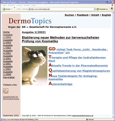 Skin Care Forum informiert in verschiedenen Rubriken über aktuelle Entwicklungen auf dem Gebiet der Kosmetik. Auf einer Navigationsleiste hat der Leser die Möglichkeit, zwischen den online erschienen Ausgaben zu surfen. Besonders beliebt sind die „Titelbilder“ der Online-Ausgaben von Skin Care Forum. Hierbei handelt es sich um Illustrationen der menschlichen Haut, von denen einige Aufnahme in diverse Fachbücher gefunden haben. Weitere Entwicklung des Dermopharmazie-Portals Durch die kontinuierliche Erweiterung des Informationsangebotes sowohl zu bereits berücksichtigten als auch zu anderen dermopharmazeutischen Themen wird sich die unter der GD-Homepage aufgebaute Online-Bibliothek in nächster Zeit erheblich vergrößern. Dies wird, unterstützt durch die hochrangigen Listungen der verbundenen Homepages in internationalen Suchmaschinen, zu einem weiteren Anstieg der für ein fachspezifisches Internetportal schon heute sehr hohen Besucherzahlen führen. Schon in Kürze wird die GD-Homepage um ausführliche Informationen zum Thema „Heller Hautkrebs“ erweitert. Wie in der letzten Ausgabe von DermoTopics (Nr. 1/2003) berichtet, will sich die GD auf diesem Gebiet verstärkt engagieren. Über ihre Task Force „Licht.Hautkrebs.Prävention“ will die Gesellschaft die hellen Hautkrebsarten (Non Melanoma Skin Cancer) stärker in das öffentliche Bewusstsein rücken und auf Evidenz basierende Empfehlungen zu deren Diagnose, Therapie und Prophylaxe erarbeiten. Im Zusammenhang mit diesem Vorhaben wird die GD-Homepage als etablierter Kommunikationsweg der Gesellschaft eine wichtige Rolle spielen. nach oben |