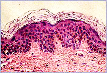 In junger Haut ist der untere Teil der Haut, die Dermis sehr regelmäßig aufgebaut. Diese klare Struktur ist im Alter gestört: Die Dermis enthält unregelmäßige Strukturen und Fehlstellen und erscheint weniger kompakt. Die nächsthöhere Schicht, die Epidermis, ist im Alter etwas dünner als in junger Haut. Viel auffälliger als diese geringe Änderung der Epidermisdicke ist aber das Verschwinden der Krümmungen der epidermalen-dermalen Grenzfläche. In gealterter Haut ist diese Grenzfläche flach, was zu einer Schwächung der Kohäsion zwischen Dermis und Epidermis führt. In der obersten Schicht schließlich, dem Stratum Corneum, sind im Mikroskop kaum Unterschiede festzustellen.