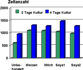 An 2 und 4 Tage alten Fibroblasten-Kulturen wurden verschiedene Peptidextrakte auf Förderung der Proliferation und der Proteinsynthese untersucht (Abbildung 2).