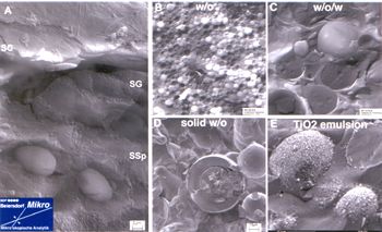 Anhand der Anwendung morphologischer Untersuchungsmethoden im Ultrastrukturbereich wie konfokale Laser-, Rasterelektronen-, Transmissions- und Rasterlelektronenmikroskopie beschrieb Roger Wepf (Hamburg) die sehr differenzierte Darstellung von Haut. Diese Techniken decken z. B. Änderungen des Desquamationsprozesses auf, bis hin zur Darstellung von individuellen Hornzellenoberflächen. Mit dem Einsatz von speziellen Kryotechniken sind auch die Zelldichte und inter- wie intrazelluläre Reorganisationen in verschiedenen Hautschichten darzustellen. Selbst wenn diese Techniken nicht im Routinebetrieb Anwendung finden, ist es doch möglich, biochemisch-strukturelle Basisphänomene zu dokumentieren und Wirknachweise optisch zu ergänzen. Eindrucksvoll demonstrierte Wepf die Interaktion von verschiedenen kosmetischen Emulsionen mit menschlicher Haut, frei von üblichen präparationsbedingten Artefakten (Abbildung 5). Durch geeignete Quantifizierungsschritte im Fortgang dieser morphologischen Methodik lässt sich beispielsweise auch die Wirkung von Öl-in-Wasser (O/W) Emulsionen auf die Hornschichten und Zunahme der Corneodesmosomen belegen.