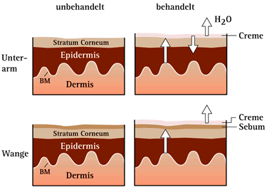 Abbildung 8: Unterschied in Wasser- und Lipidgehalt nach Applikation einer hydratisierten Creme auf die Arm- bzw. Wangenhaut.
