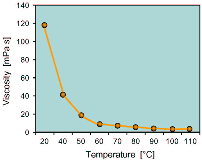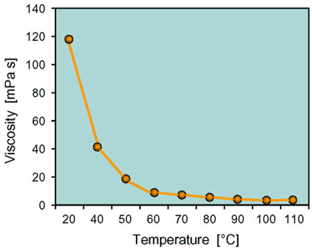 Versagel® hydrocarbon gels are in contrast to "usual" gels shear thickening. The dynamic viscosity increases with increasing shear stress, i.e. with increasing mechanical agitation. Obviously these systems behave like highly concentrated dispersions of the well solvated gelling agent. With increasing temperature the systems go through drastic viscosity drop in the range of the skin surface temperature as can be seen for example from a gel based on Isopropyl Palmitate (Fig. 4). This makes the application easier and favours a homogenous distribution on the skin.