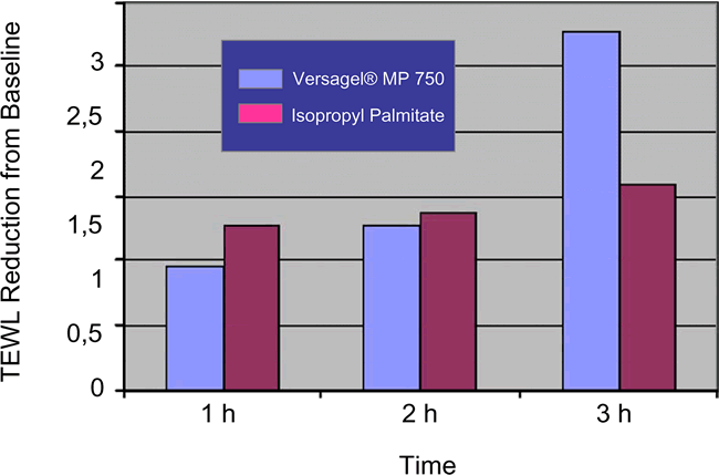 Compared to the properties of the pure lipid phase, oleo gels show a higher substantivity. Thus, the transepidermal water loss (TEWL) is reduced for a longer period during a short-term test (Fig. 5).