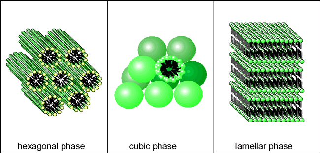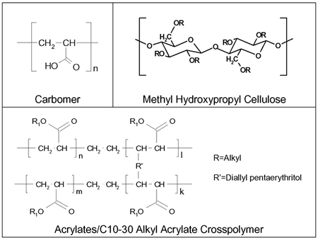 Surfactant gels Surfactant gels are lyotropic liquid crystals. They form by association of hydrated or solvated surfactant molecules. Depending on the structure and concentration of the surfactant differently arranged liquid crystalline phases may form (Fig. 6). Cubic and hexagonal liquid crystals behave clearly visco-elastic, showing the rheological behaviour of both solid and liquid. In common with most typical gels, they possess a substantial yield stress. Cubic surfactant gels react highly elastic upon mechanical agitation. As their oscillating frequency is within the acoustic range, they are called ringing gels. Lamellar liquid crystals are regularly arranged in one dimension and are thus more fluid than cubic or hexagonal phases. However, they are, although less pronounced, also visco-elastic. Surfactant gels seem to be interesting for topical use because they can potentially interact with the intercellular epidermal lipids. The colloidal structure of lamellar phases and the stratum corneum lipids is very similar. The interaction with the skin and the resulting penetration enhancing effect seems to be correlated with the high concentration of surfactants. This affects the structure of the epidermal lipids and thus increases the skin permeability. Lyotropic liquid crystals may also provide improved skin care benefits. Conversely, the irritation potential may also increase with increasing surfactant content. This requires a careful of benefits and risks.. Furthermore it must be considered, that the water content after dermal application will change. Within a few minutes the water content reduces dramatically. This will alter the state of surfactant gels according to their phase behaviour (Fig. 7). When, for example, a cubic phase is applied to the skin it turns into a lamellar phase and ends up as an inverted micellar system at a low water content. Whereby several multi-phase transitional states are also observed. This metamorphosis of the vehicle is known for a longer period, however, its influence on the interaction of the vehicle with the skin is only little investigated so far. Hydro-dispersion gels Hydro-dispersion gels are dispersed systems consisting of a hydrophilic continuous phase and a lipophilic dispersed phase. Usually, hydro-dispersion gels are oil-in-water emulsions with a content of liquid lipid phase between 2 and 20 %. In contrast to classical emulsions, the required stabilization is not provided by the addition of traditional emulsifiers but by means of suitable macromolecules (Figure 8). This is stressed when such formulations in particular in the field of sun care products are called "emulsifier-free". Apart from the interfacially stabilized hydro dispersion gels there are products on the market where relatively small amounts of lipid are solely stabilized by the viscosity enhancing effect of the added polymer. Such "quasi"-emulsions are also termed "Balm". The ingredient list of an appropriate formulation is given in Table 4. The physical stability and an adequate shelf life are obtained through finely dispersing the lipids. This measure and the yield value of the external phase reduce droplet mobility and thus effectively prevent creaming and coalescence of the oil droplets. Even persons with sensitive skin tolerate well hydro-dispersion gels. Their application can be recommended on normal or seborrhoeic skin in particular when large amounts of alcohol are added for antimicrobial preservation. The stabilizing action can be categorized into two classes : (1) Stabilization by enhanced viscosity (so-called "quasiemulsions") (2) interfacial stabilization. In practice, often either of these two mechanisms is responsible for the storage stability with one component being more dominant. Polymers are frequently added to increase the stability of an emulsion by thickening and adding yield value to the continuous phase. Such formulations where no interfacial activity is involved in the stabilizing action of the polymer are obtained when solely polyacrylic acid is used as a stabilizer. In the literature, such preparations are termed "quasi"-emulsions. Appropriate products on the market, often named "balm", usually consist of considerably small amounts of lipids dispersed in a hydrogel. The physical stability and an adequate shelf life are obtained through finely dispersing the lipids. This measure and the yield value of the external phase reduce droplet mobility and thus effectively prevent creaming and coalescence of the oil droplets. The ingredient list of an appropriate formulation is given in Table 2. Table 2: Qualitative Formula of a Lipid-containing Sun Protection Gel ("Pseudo emulsion")