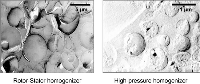 In the production the components of the lipid phase are melted and the acrylate dispersed. At about 60 °C the lipid and the aqueous phase are put together and then homogenized. After cooling to 30 °C fragrance is added and once again homogenized. The physical stability of such a product corresponds without any problem the requirements of the KosmV to be able to waive a declaration of shelf life. Typically, storage at 40°C for 6 months and at room temperature for a period of at least 30 months is possible without essential loss in quality. If products with an acceptable shelf life and an increased lipid content have to be formulated a more effective stabilizer is required. This can be achieved by using surface-active polymers, e.g. carbomer 1342 or hydroxypropyl methylcellulose, as primary emulsifiers. Such polymers form structured interfacial films, which effectively prevent the coalescence of oil drops. In this case, the increase of the viscosity of the external phase plays only a minor role for the stabilizing action. Carbomer 1342, a frequently used derivative of poly acrylic acid, displays such properties. Carbomer 1342 polymeric emulsifiers are copolymers of acrylic acid, modified by C10-30-alkyl acrylates, and crosslinked with allylpentaerithrol. The hydrophilic acrylic acids portion dominates the lipophilic alkyl acrylate portion. The molecular weight of the resulting giant molecule is 4 x 109. The substance swells 1000-fold after neutralization with an appropriate base but it does not dissolve. In aqueous media with low electrolyte concentration carbomer polymeric emulsifiers form thick protective gel layers around each oil droplet with the hydrophobic alkyl chains anchored in the oil phase. This allows to emulsify up to 20 per cent oil with typical usage levels of only 0.1 to 0.3 per cent of the polymeric emulsifier. Upon contact with the electrolyte containing surface of the skin such emulsions become unstable because the protective gel layer deswells instantly. The oil phase is released and a thin oil film deposits on the skin. High performance homogenizers should be used carefully to avoid mechanical degradation of the high molecular weight polymeric emulsifiers which would then decrease emulsion stability. Such preparations often exhibit a mean droplet diameter between 20 and 50 µm. However, this has no negative impact on the physical stability. If for aesthetic reasons a finely dispersed system (1 - 5 µm) is desired, the addition of an amphiphilic co-emulsifier, e.g. sorbitan monooleate, is recommended. The increase of the viscosity of the external phase plays only a minor role for the stabilizing action. Contrary to those hydrolipid dispersions with carbomer 1342 polymeric emulsifiers, preparations with HPMC as polymeric emulsifier are less sensitive to electrolytes. Therefore o/w emulsions with a normal saline solution as the external phase are still stable on storage. When applied on the skin, the mechanical stress may cause a partial breakdown of these emulsions and a thin oil film spreads on the skin, thus reducing the wettability of the skin. After the water evaporates, the emulsion remains partially on the skin and forms a flexible film where oil droplets are embedded into a polymer matrix. The preparation of HPMC stabilized emulsion can be performed using a rotor stator homogenizer, e.g. Ultra Turrax®, yielding a mean droplet size between 2 and 5 µm. Nanoemulsions with a mean diameter between 100 and 500 nm can be achieved by using high energy input from ultra sound or high-pressure homogenization (Fig. 9) The resulting emulsions are fluid and can be applied conveniently by spraying.