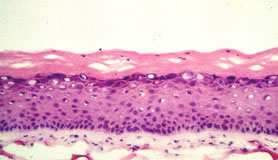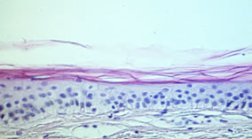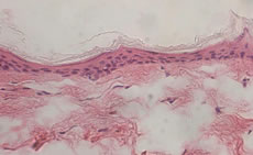 In junger Haut ist der untere Teil der Haut, die Dermis sehr regelmäßig aufgebaut. Diese klare Struktur ist im Alter gestört: Die Dermis enthält unregelmäßige Strukturen und Auflockerungen und erscheint weniger kompakt. Die nächsthöhere Schicht, die Epidermis, ist im Alter etwas dünner als in junger Haut. Viel auffälliger als diese geringe Änderung der Epidermisdicke ist aber das Verschwinden der Krümmungen der epidermalen-dermalen Grenzfläche. In gealterter Haut ist diese Grenzfläche flach, was zu einer Schwächung der Kohäsion zwischen Dermis und Epidermis führt. In der obersten Schicht schließlich, dem Stratum Corneum, sind im Mikroskop kaum Unterschiede festzustellen. Die Ursachen dieser histologischen Veränderungen in gealterter Haut sind erst in den Grundzügen bekannt und Gegenstand intensiver Forschungsanstrengungen. Heute ist bekannt, dass die Hautalterung nicht nur die Dermis betrifft, hier ist vor allem der veränderte Stoffwechsel der extrazellularen Matrixbestandteile zu nennen (1), sondern auch die Epidermis (2) und die Basalmembran zwischen diesen beiden Hautschichten (3). Effiziente Antiage-Produkte müssen daher ein breites Wirkungsspektrum auf alle relevanten Hautschichten aufweisen. Wirkstoffuntersuchungen am in-vitro-Ganzhautmodell Ganzhautmodelle, auch dreidimensionale Hautmodelle genannt, entstehen durch Rekonstruktion einer Dermis und einer Epidermis unter definierten Laborbedingungen. Gegenüber konventionellen Fibroblasten-Kulturen oder Epidermismodellen weisen sie eine ganze Reihe von Vorteilen auf, die insbesondere bei der Wirkstoffprüfung von großem Nutzen sind (4,5): 1. die Möglichkeit der Langzeitkultivierung mit wiederholter Anwendung wirkstoffhaltiger Cremeformulierungen, 2. die Ähnlichkeit zur menschlichen Haut hinsichtlich Struktur und Wechselwirkungen zwischen Dermis und Epidermis 3. eine vergleichbare Expression von Keratinocyten-Differenzierungsmarkern wie Cytokeratin-10, Filaggrin und Transglutaminase 4. eine vergleichbare Expression von Proteinen der Basalmembran, wie Laminin und Collagen IV 5. eine vergleichbare Expression von extrazellularen Matrixproteinen wie Collagen I und III, sowie - in unserem Modell - Elastin. Durch sukzessives Züchten einer Dermis aus Fibroblasten und einer Epidermis mit Stratum Corneum aus Keratinocyten entsteht innerhalb von 5 Wochen ein Ganzhautmodell, das alle wesentlichen Schichten der Haut enthält (6) (Abb. 2). Die immunohistologische Analyse zeigt, dass sowohl die epidermalen Differenzierungsmarker als auch die Proteine der Basalmembran und der dermalen Matrix ähnlich exprimiert werden (Tab. 1). Abb. 2: Histologischer Vergleich zwischen Ganzhautmodell (oben) und normaler menschlicher Haut (unten)