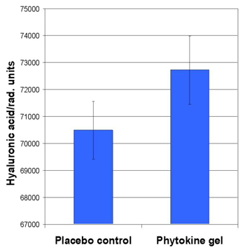 In dem hier verwendeten Hautmodell exprimieren die Fibroblasten auch Elastin (Abb. 4). Der Einfluss verschiedener Wirkstoffe auf Elastinmenge und Ausrichtung der Elastinfasern ist Gegenstand der aktuellen Forschung. Hyaluronsäure-Metabolismus Weitere Polymerfamilien in der extrazellularen Matrix sind Proteoglycane, Glycosaminoglycane, zu denen zum Beispiel die Hyaluronsäure gehört, und strukturelle Glycoproteine, wie Fibronectin und Laminin. Proteoglycane und Glycosaminoglycane füllen den Raum zwischen den Fasern aus und sind an der strukturellen Ausrichtung und einer ausreichenden Hydratisierung der Collagenfaserbündel beteiligt (1). Die Hyaluronsäure ist ein hochmolekulares Polysaccharid, das große Wassermengen binden kann. Die Abnahme der Hautfeuchtigkeit im Alter wird mit der Abnahme von Hyaluronsäure erklärt (1). Für das Soya-Phytokine konnte am Ganzhautmodell gezeigt werden, dass es neben der Stimulierung der Collagensynthese auch die Hyaluronsäuresynthese um 3% steigert, eine kleine aber dennoch signifikante Zunahme (15), die in einer in-vivo Studie bestätigt werden konnte (16) (Abb. 5). Fehlende Hyaluronsäure kann so im Innern der gealterten Haut ersetzt werden. Abb. 5: Stimulierung der Hyaluronsäuresynthese durch ein 10%iges Phytokine -Gel im Ganzhautmodell nach 2 Wochen Behandlung (Inkorporierung von radioaktivem Glucosamin; Mittelwert SD).