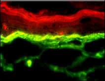 Elastin-Metabolismus Obwohl sie mit einem Gewichtsanteil von 1-3% nur in untergeordneter Menge in der Dermis vorkommen (1), sind Elastine für die Hautelastizität entscheidende Matrixproteine. Insbesondere unter Sonnenlichteinfluss verändert sich der Elastin-Metabolismus. In photoexponierter Haut (Krähenfußbereich) treten - verglichen mit lichtgeschützten Hautstellen - gehäuft solare Elastosen auf, in denen der Elastingehalt deutlich erhöht ist (17,18). Das Elastinnetzwerk ist dichter, weniger geordnet und teilweise aggregiert (19). Die Elastinfasern sind in junger Haut überwiegend vertikal zur dermalen-epidermalen Grenzschicht ausgerichtet. Im Alterungsprozess werden sie lysiert und durch weniger geordnete, vor allem horizontal ausgerichtete Elastinfasern ersetzt (1). Es wird vermutet, dass diese Strukturveränderungen wesentlich zur Abnahme der Hautelastizität im Alter beitragen. Mit dem Torquemeter wurde in vivo eine Abnahme der Hautelastizität um 18% bei Alterung über 50 Jahre gefunden (20). Abb. 4: Immunfluoreszenz-Darstellung der Elastine in normaler menschlicher Haut und im Ganzhautmodell Elastin in normaler menschlicher Haut (oben) und im Hautequivalent (unten, 250fache Vergößerung). Immunfluoreszenzstudie an gefrorenen Hautschnitten nach 14 Tagen Kultivierung an Air-Liquid Interface.