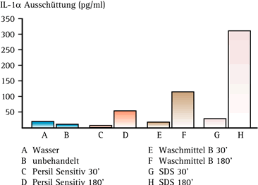 Nach einer einmaligen Applikation des Waschmittels nahm die Vitalität der Zellen in Abhängigkeit von der Applikationszeit und von der eingesetzten Testkonzentration ab. Nach 180 Minuten Applikationszeit war die Reduktion der Zellvitalität bei Persil Sensitiv deutlich geringer im Vergleich zu Waschmittel B. Dieses Ergebnis korrelierte mit der Bestimmung der Menge des ausgeschütteten Entzündungsmediators Interleukin 1alpha. Nach Applikation von Waschmittel B wurden höhere Mengen bestimmt im Vergleich zu Persil Sensitiv (Abbildung 4a Vitalität und 4b IL-1alpha Ausschüttung).